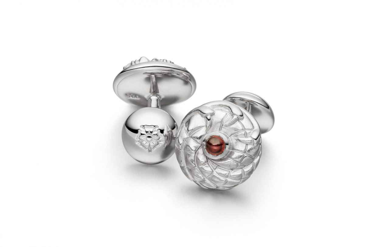 sterling-silver, rhodium-plated, with garnet cabochons.