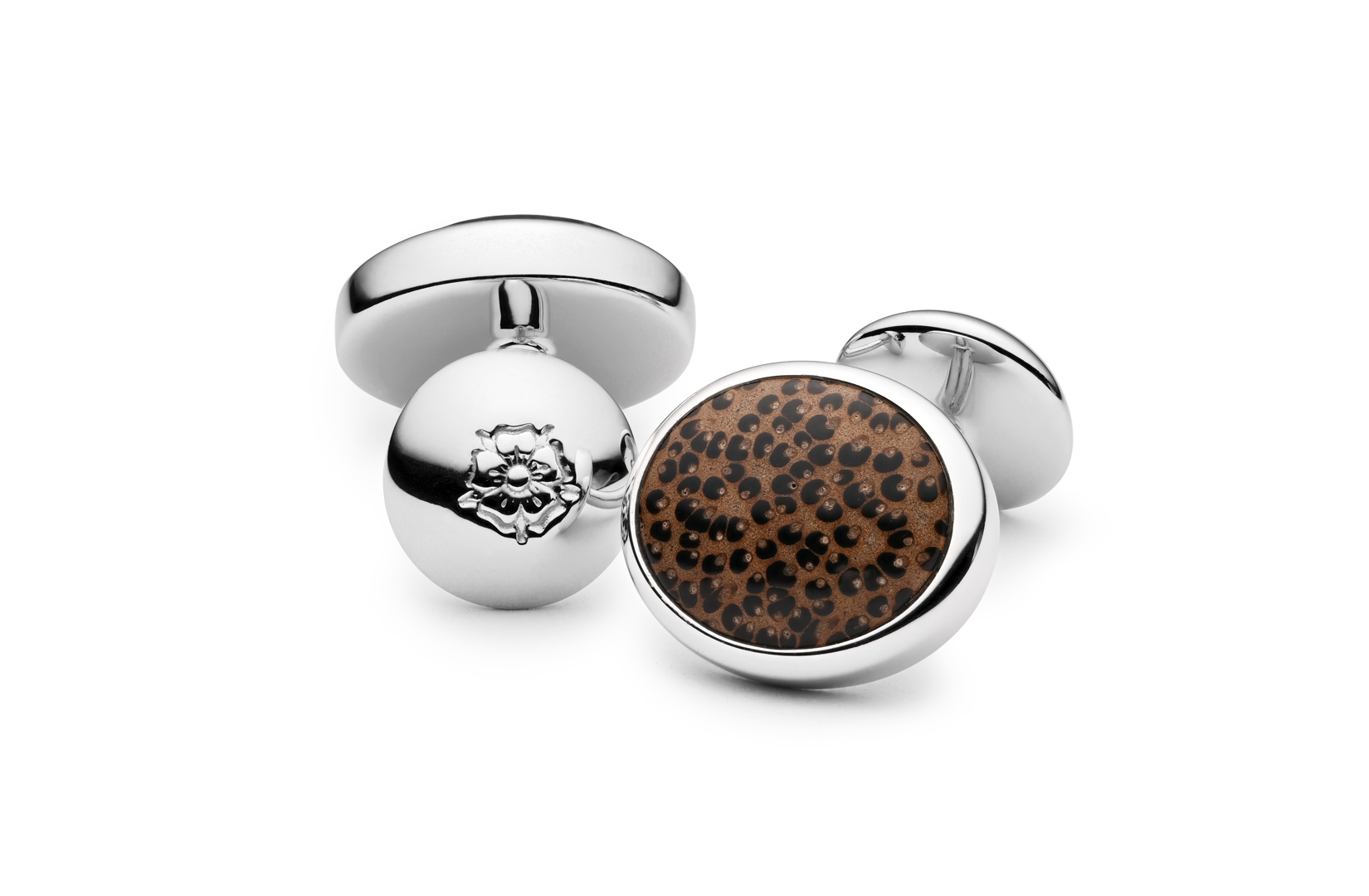 Sterling silver, rhodium-plated, with light palmwood.