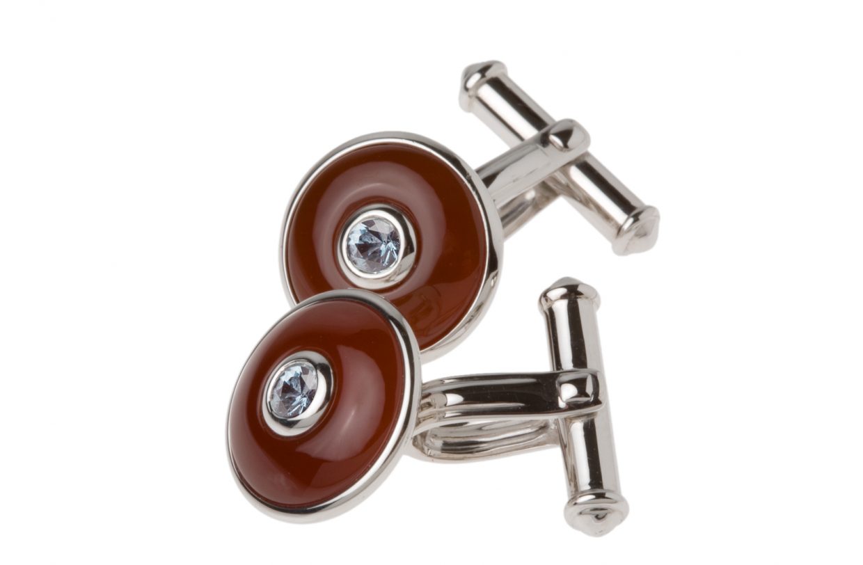 Sterling silver, rhodium-plated, with red agate and various center stones, clip.