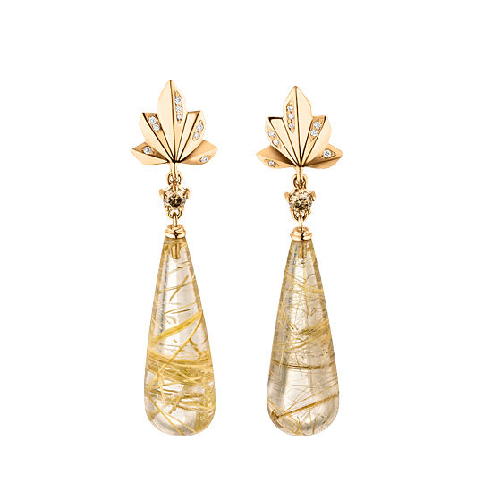 18ct rose gold with 18 white diamonds TW/VS in total approx. 0,072ct., two C2-C3 brown/nature diamonds 3,1mm in total approx. 0,23ct. and two rutilated quartz-droplets 34,12ct. Length: 4,9cm