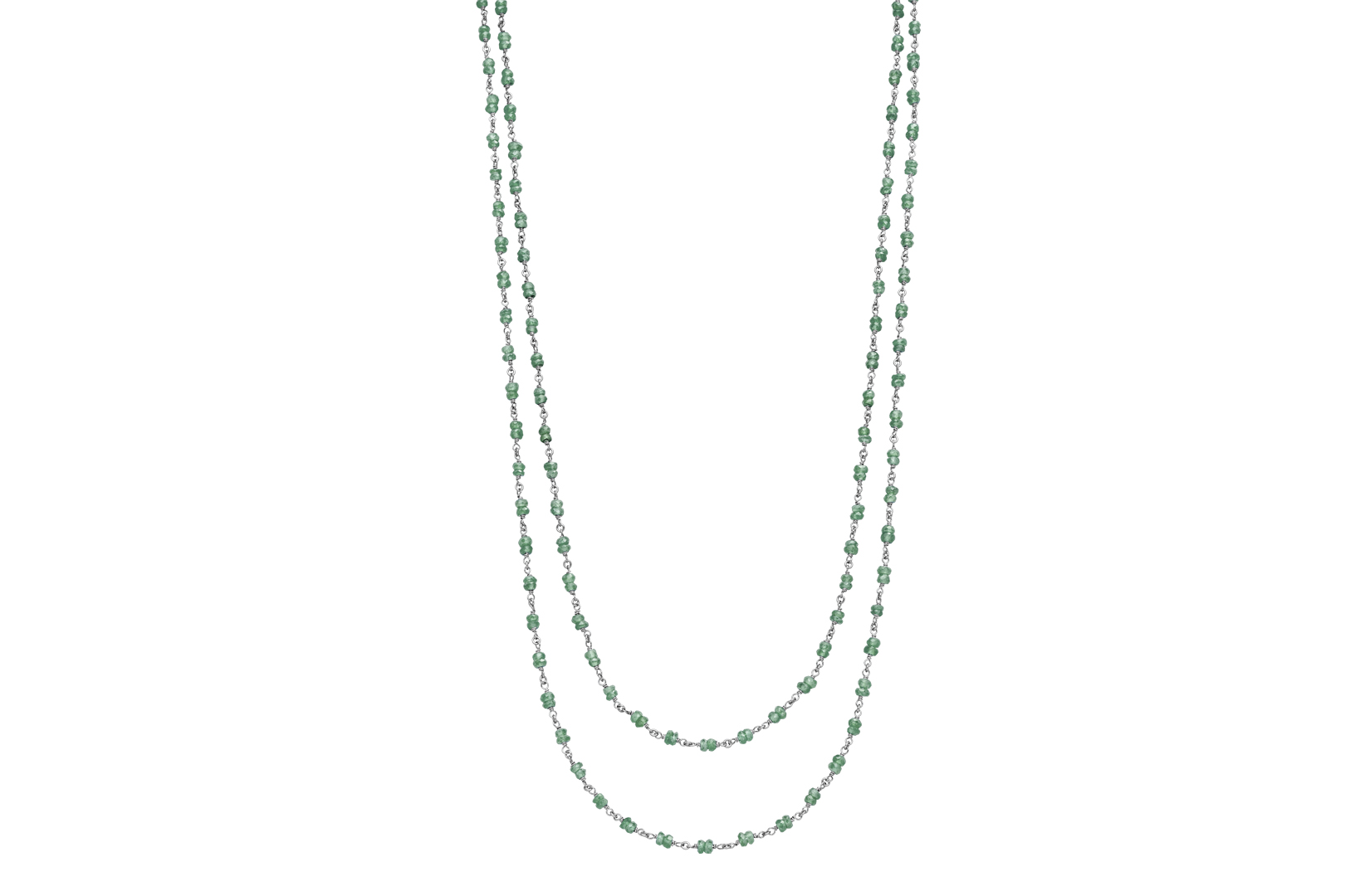 18ct white gold, rhodium-plated, with emerald-beads 3,5-4mm as double windings. Length: 45cm or 60cm.