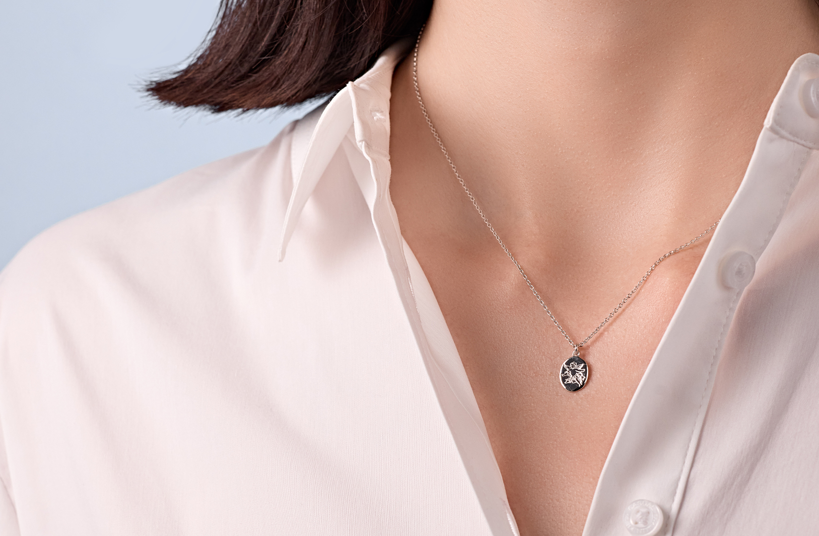 18k white gold or sterling silver, rhodium-plated, on a white gold/silver chain. Length: 42cm