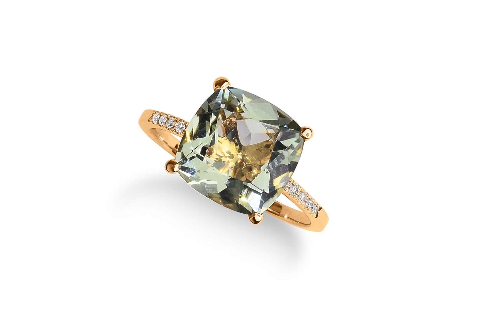 18ct rose gold with a prasiolite 2,75ct. and white diamonds HSI in total 0,05ct. Diameter of prasiolite: 1,0cm.