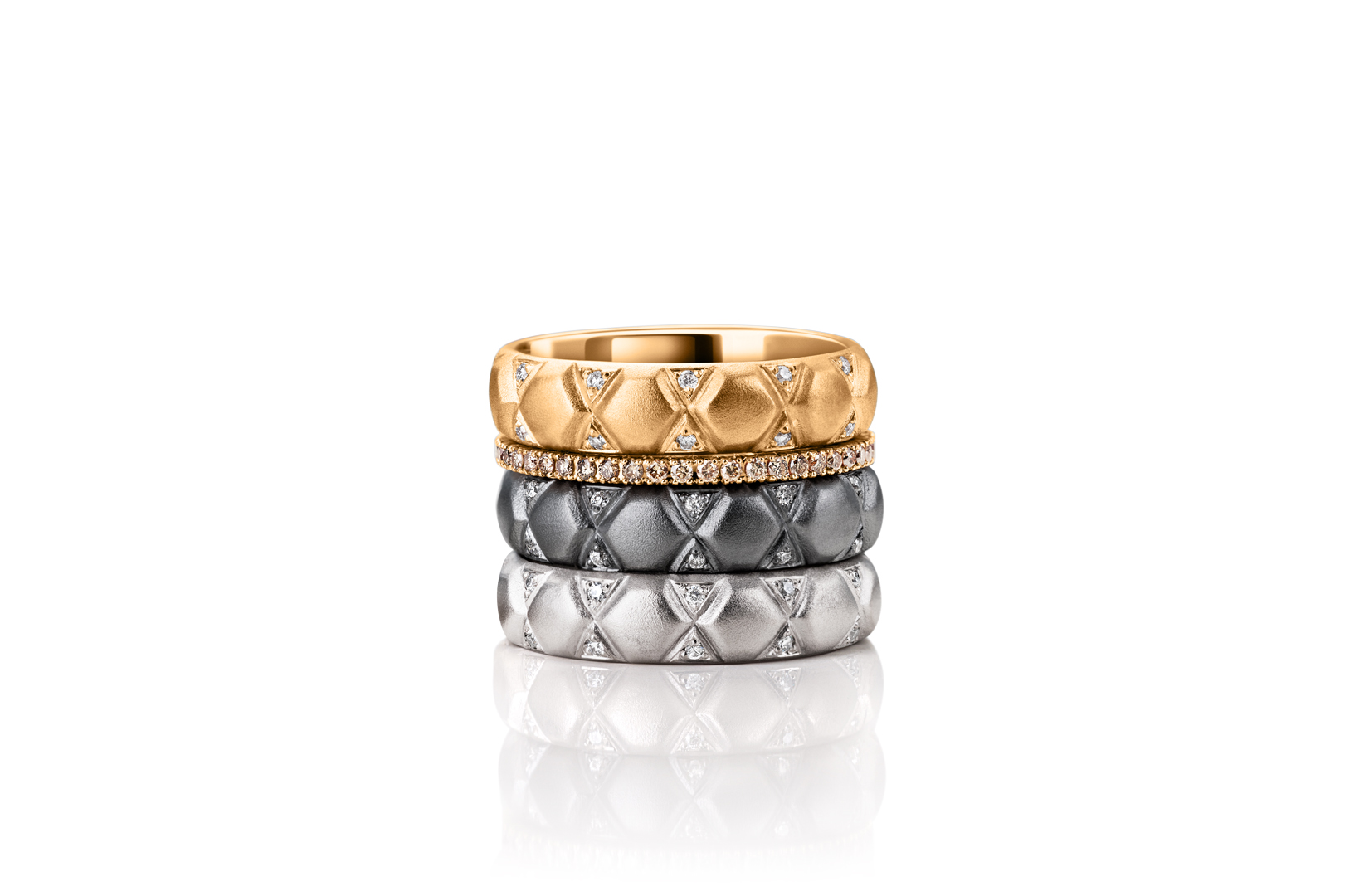 Basalt Pure rings with white diamonds TW/VS between 0,11ct. - 0,13ct. in 18k rose gold or 18k white gold with dark or light rhodium-plating. Eternity ring in 18k rose gold with champagne-coloured diamonds between 0,35ct. - 0,41ct.